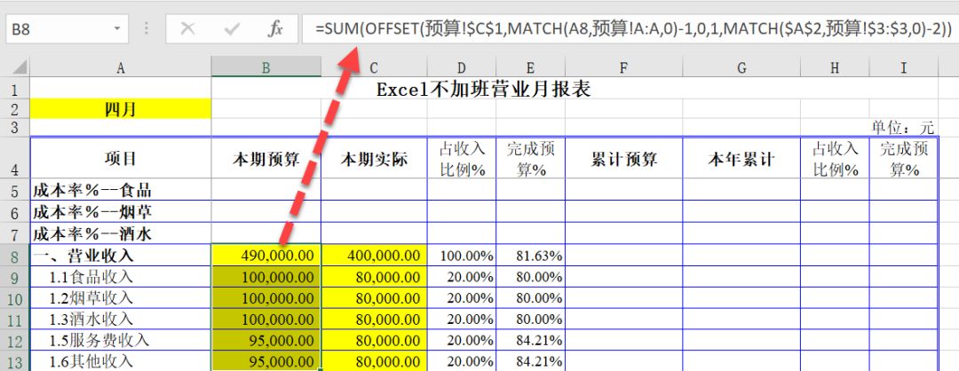 =OFFSET(预算!$C$1,MATCH(A8,预算!A:A,0)-1,0,1,MATCH($A$2,预算!$3:$3,0)-2)
