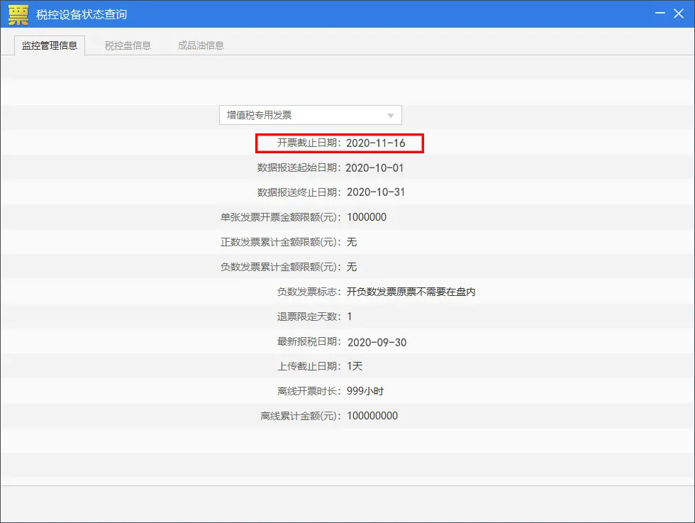 操作流程:【系统设置】-【税控设备设置】-【税控设备状态查询】,监控管理信息列表,查看各发票种类开票截止时间是否更新至2020年11月16日左右。