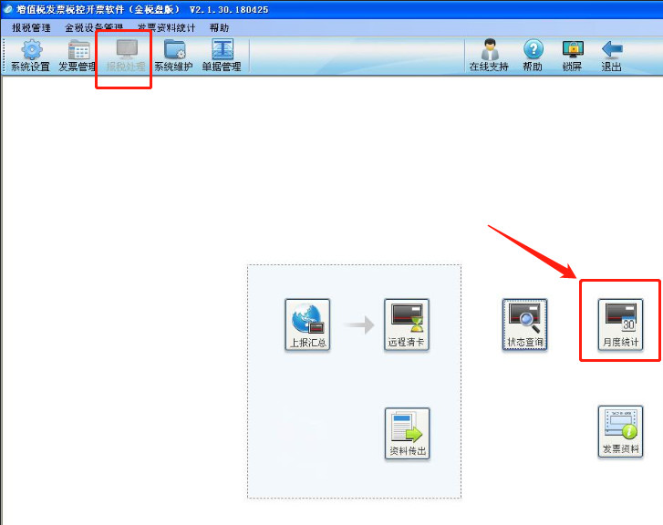 第一步:月末结束后,打开我们的开票系统(以金税盘举例),在报税处理-月度统计中查询。